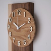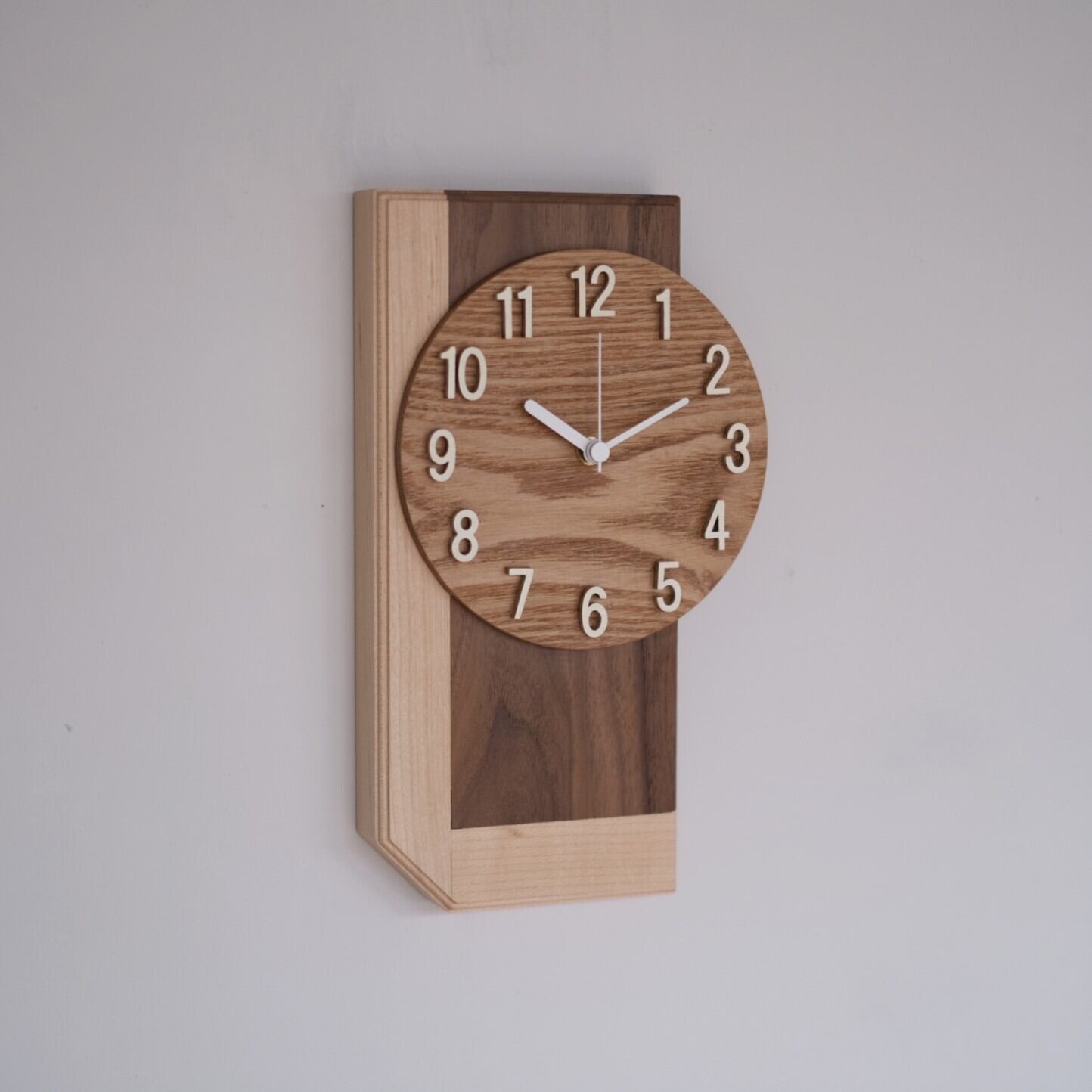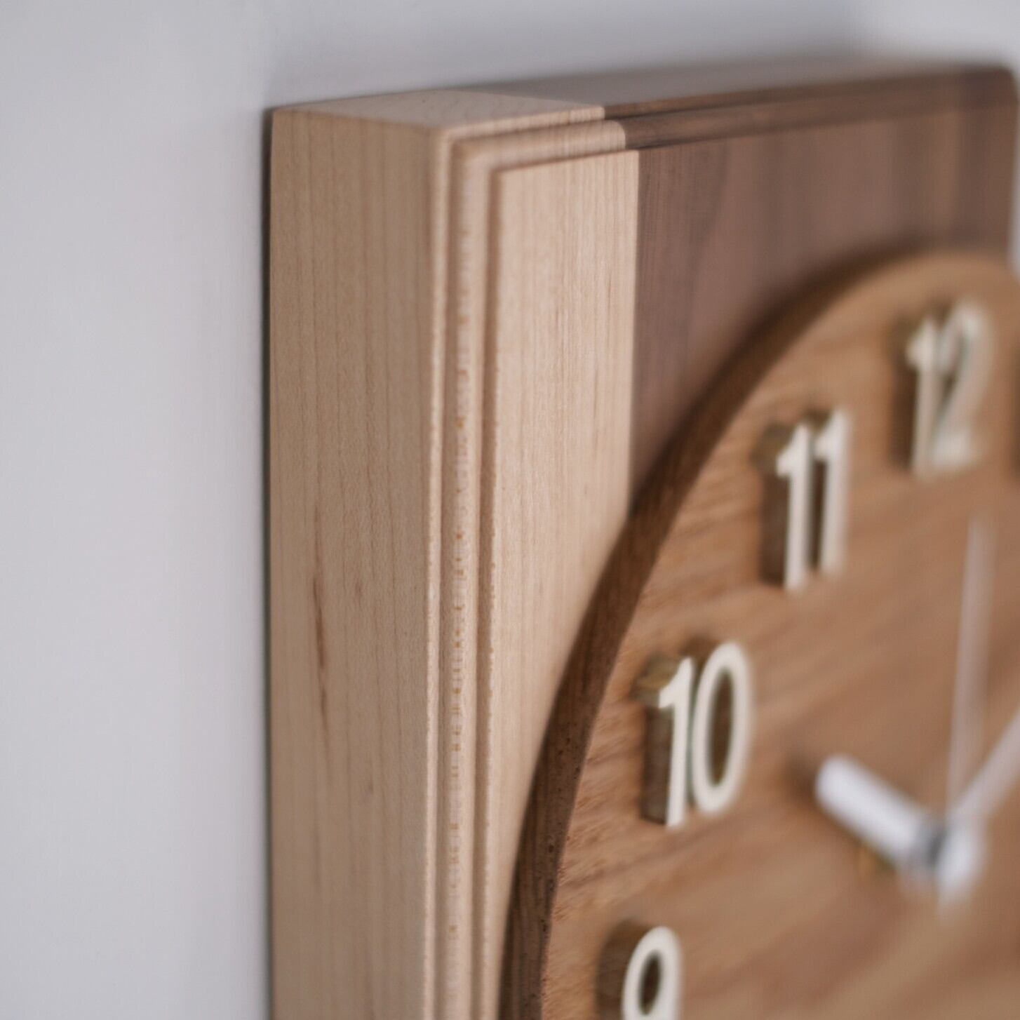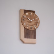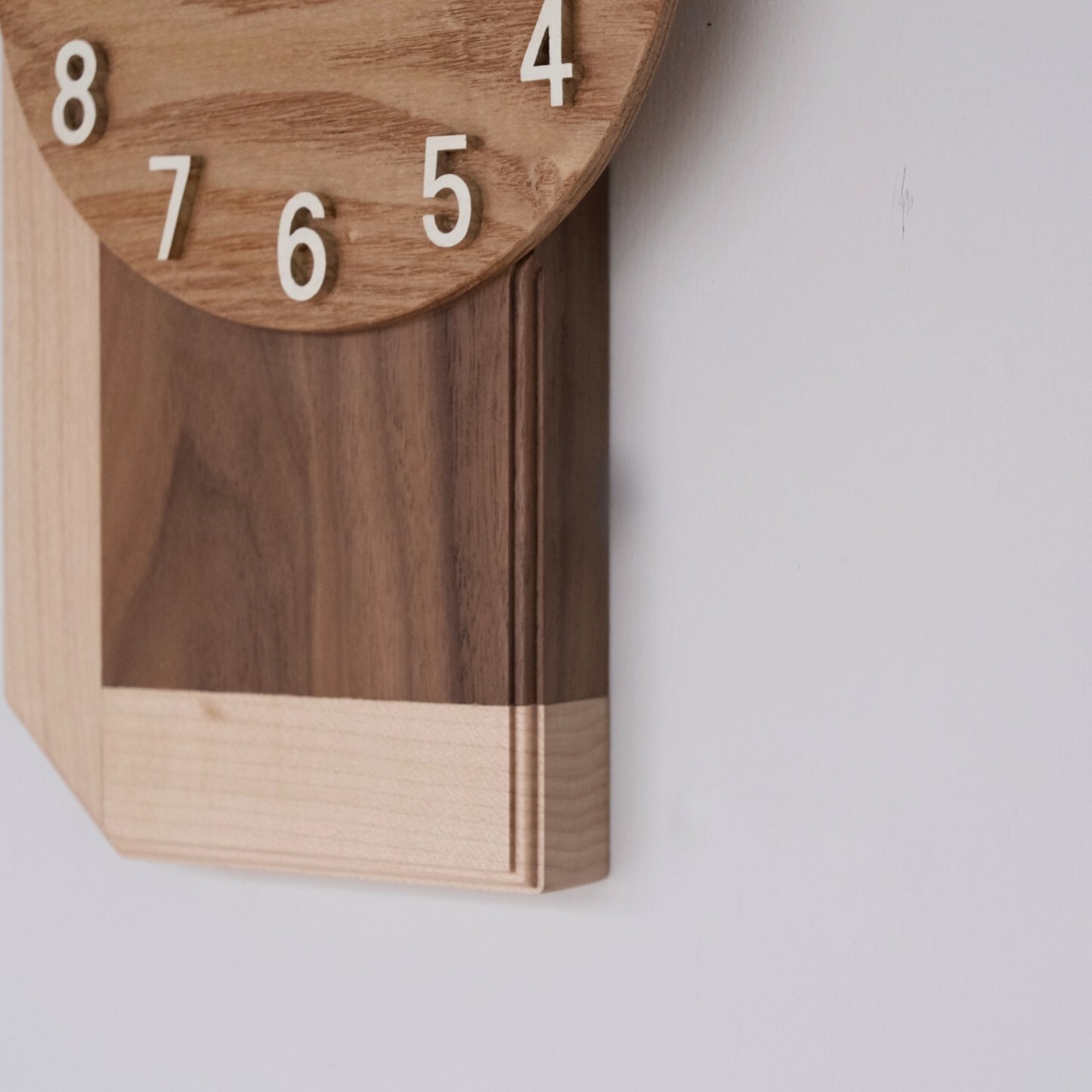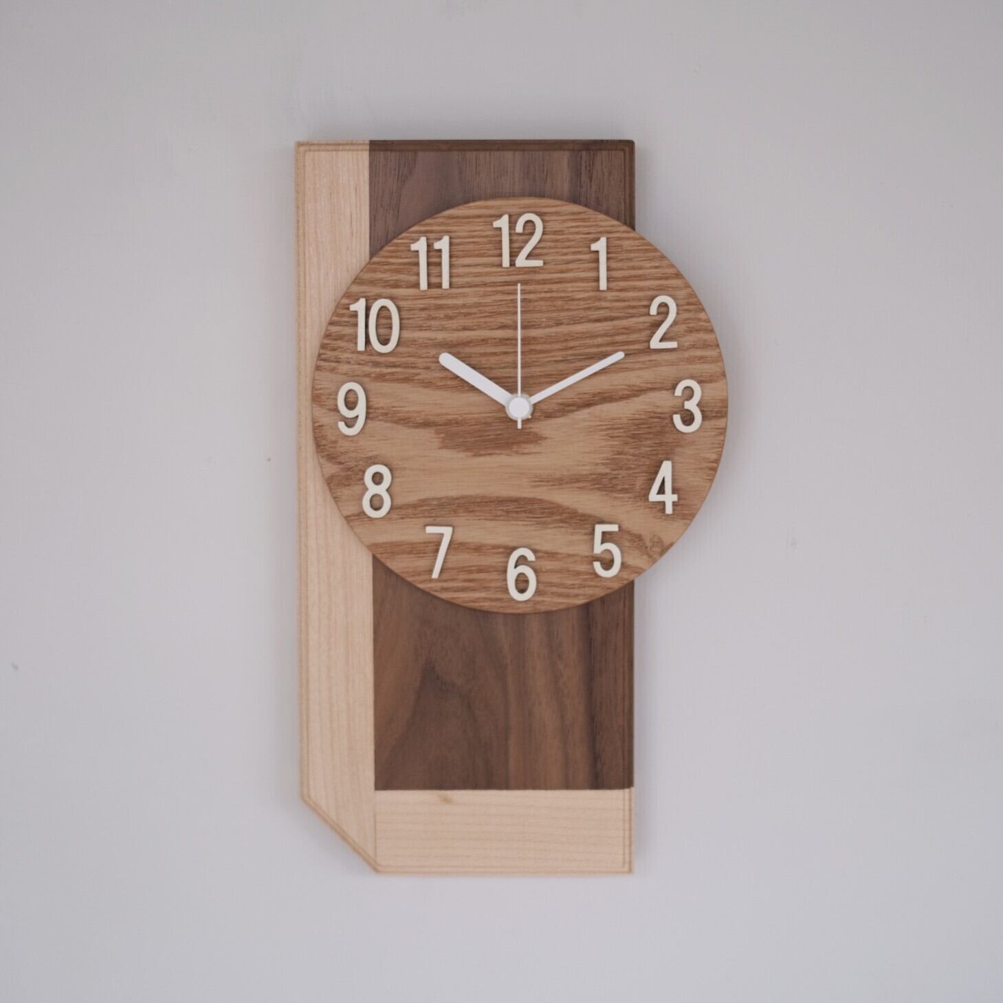 重厚感のあるウォールナットと優しい木目のハードメープルを接ぎ合わせた掛け時計です。