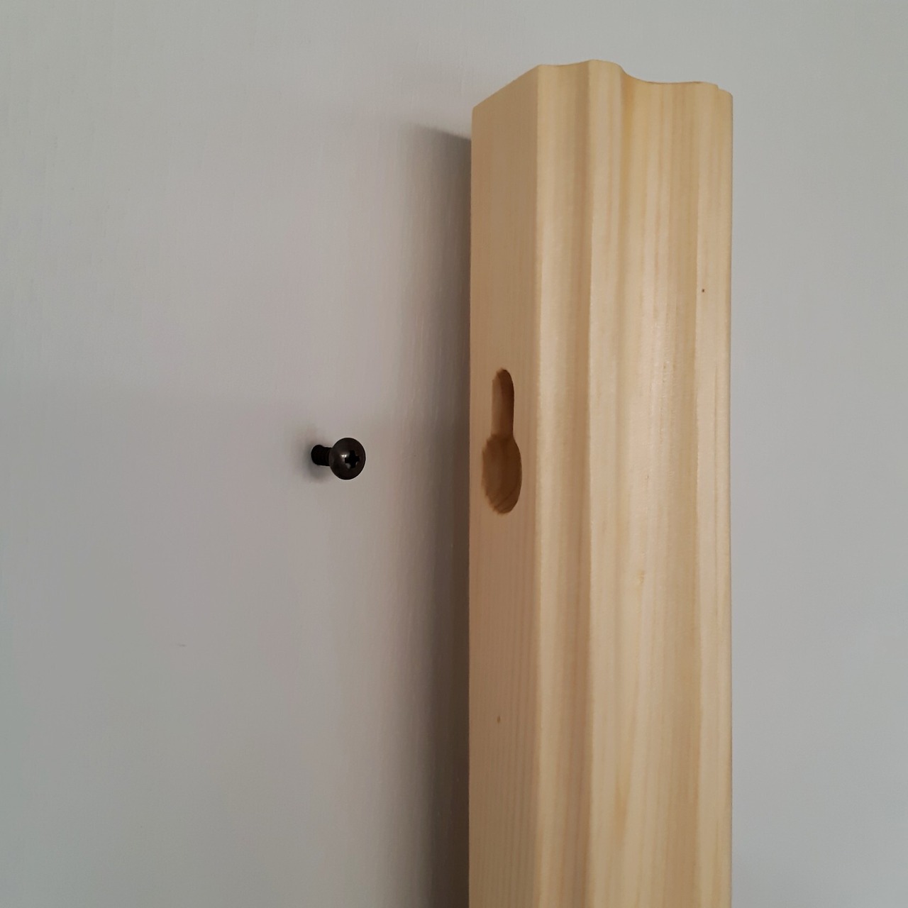 背面に鍵穴型の穴が掘り込んでありますので、掛け時計のように引っ掛けることができます。